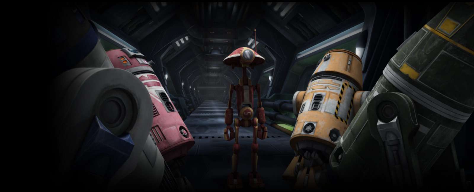 | Beschreibung: | WAC-47, R2-D2, M5-BZ, U9-C4 und QT-KT, allesamt Droiden des D-Squads, auf einem Dreadnought - Titelbild der Episode Droiden bevorzugt |