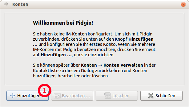 Danach - oder wenn PidGin erstmals gestartet wird (dann erscheint diese Aufforderung automatisch) - möchte man ein Konto hinzufügen (1).